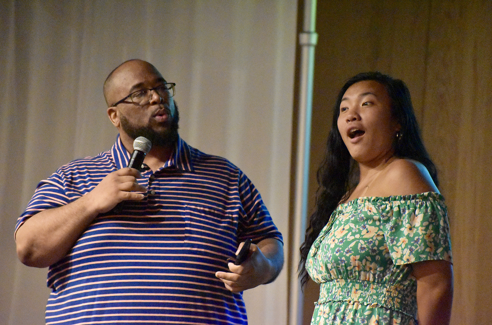 Host Kevin Manning and Miranda Schultz, Porter House KC, entertain the crowd during the Porter House KC’s Pitch Night event; photo by Nikki Overfelt Chifalu, Startland News