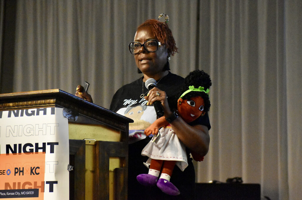 Dorothy Betts, Layla is my Joy, pitches during the Porter House KC’s Pitch Night event; photo by Nikki Overfelt Chifalu, Startland News