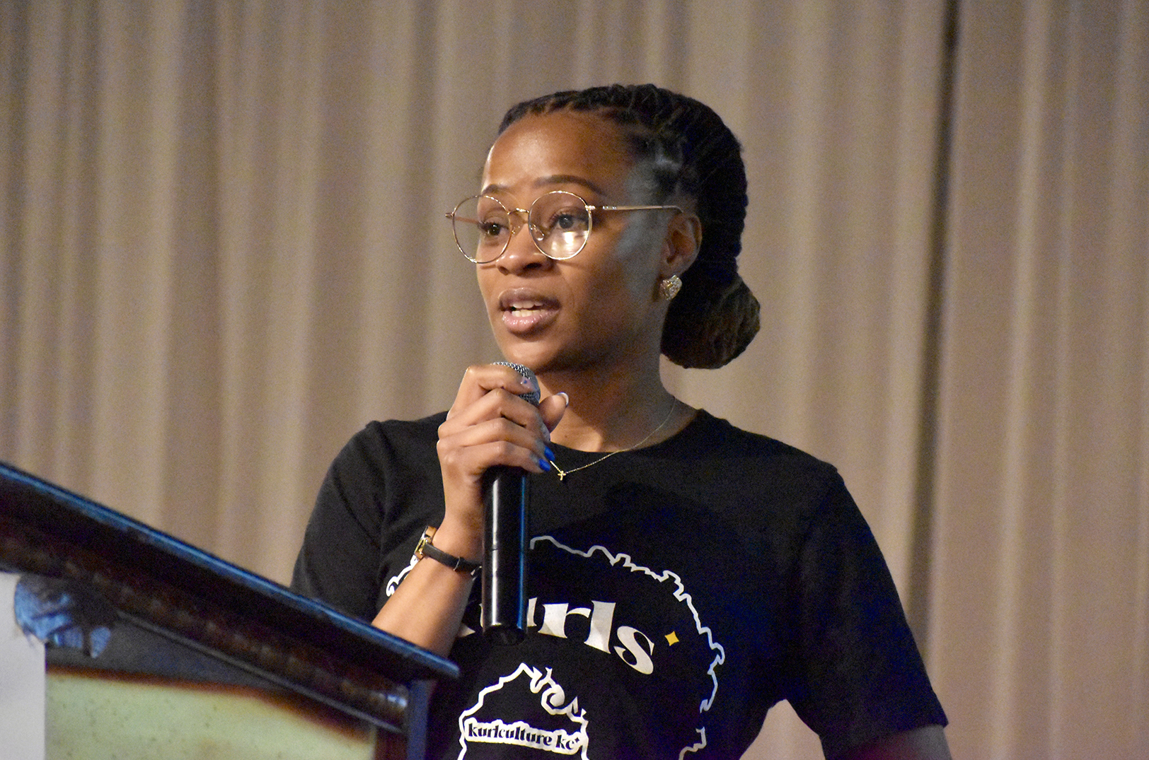 Ravon Jefferson, Kurl Culture KC, pitches during the Porter House KC’s Pitch Night event; photo by Nikki Overfelt Chifalu, Startland News
