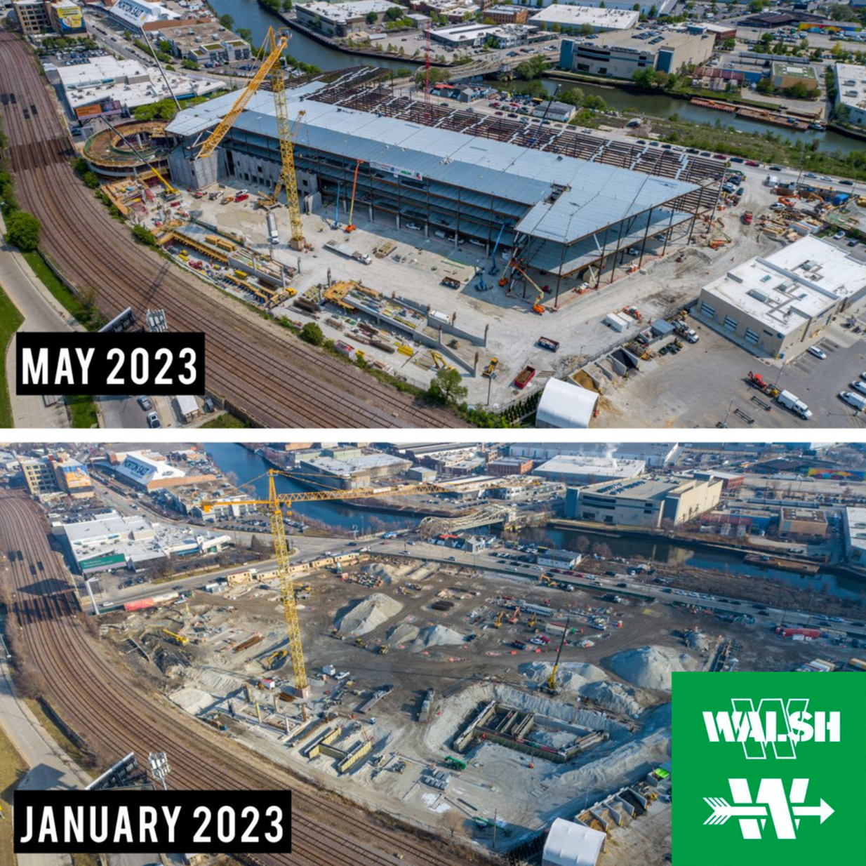 Walsh Chicago drone image from May and Jan 2023: Walsh uses PLOT to schedule unloading areas and equipment (like tower cranes, lifts) to prevent congestion at the jobsite gates.