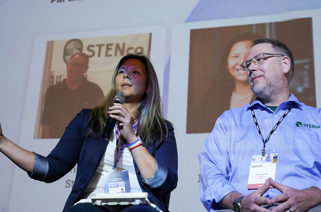 Donna Niles of Cargill and John Brown, founder of StenCo, discuss their sustainable packaging partnership June 15 during a panel at Plug and Play Topeka’s Animal Health & Ag Tech Expo; photo courtesy of Plug and Play Topeka