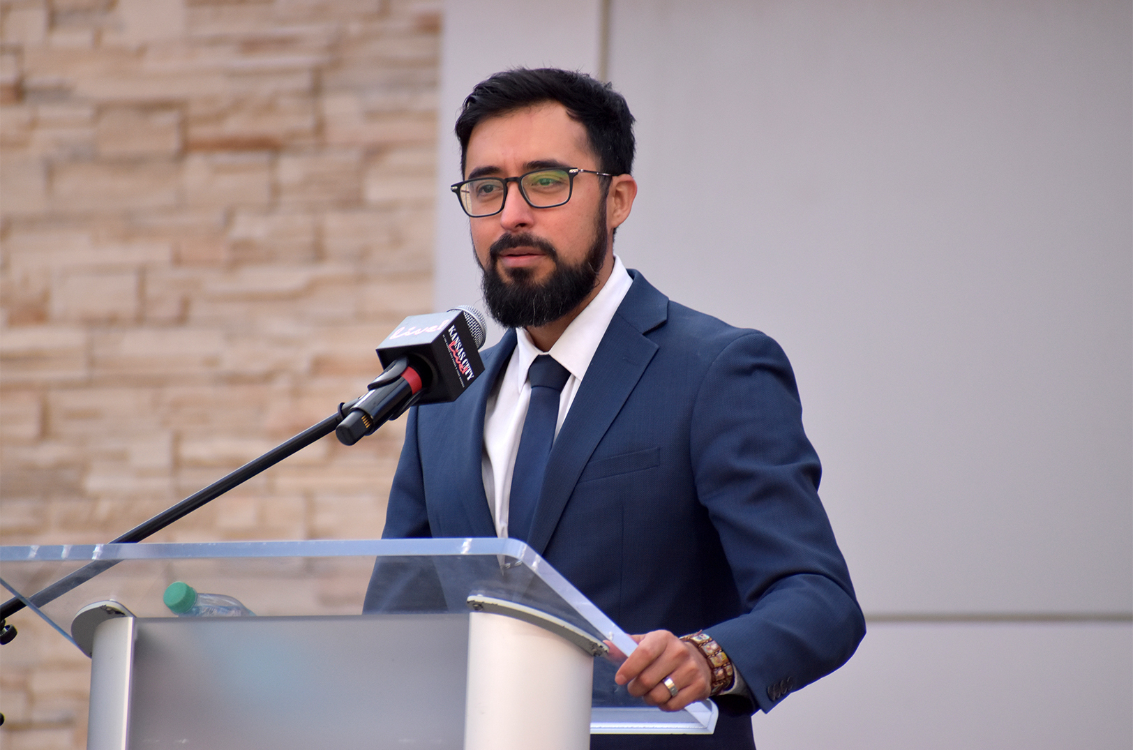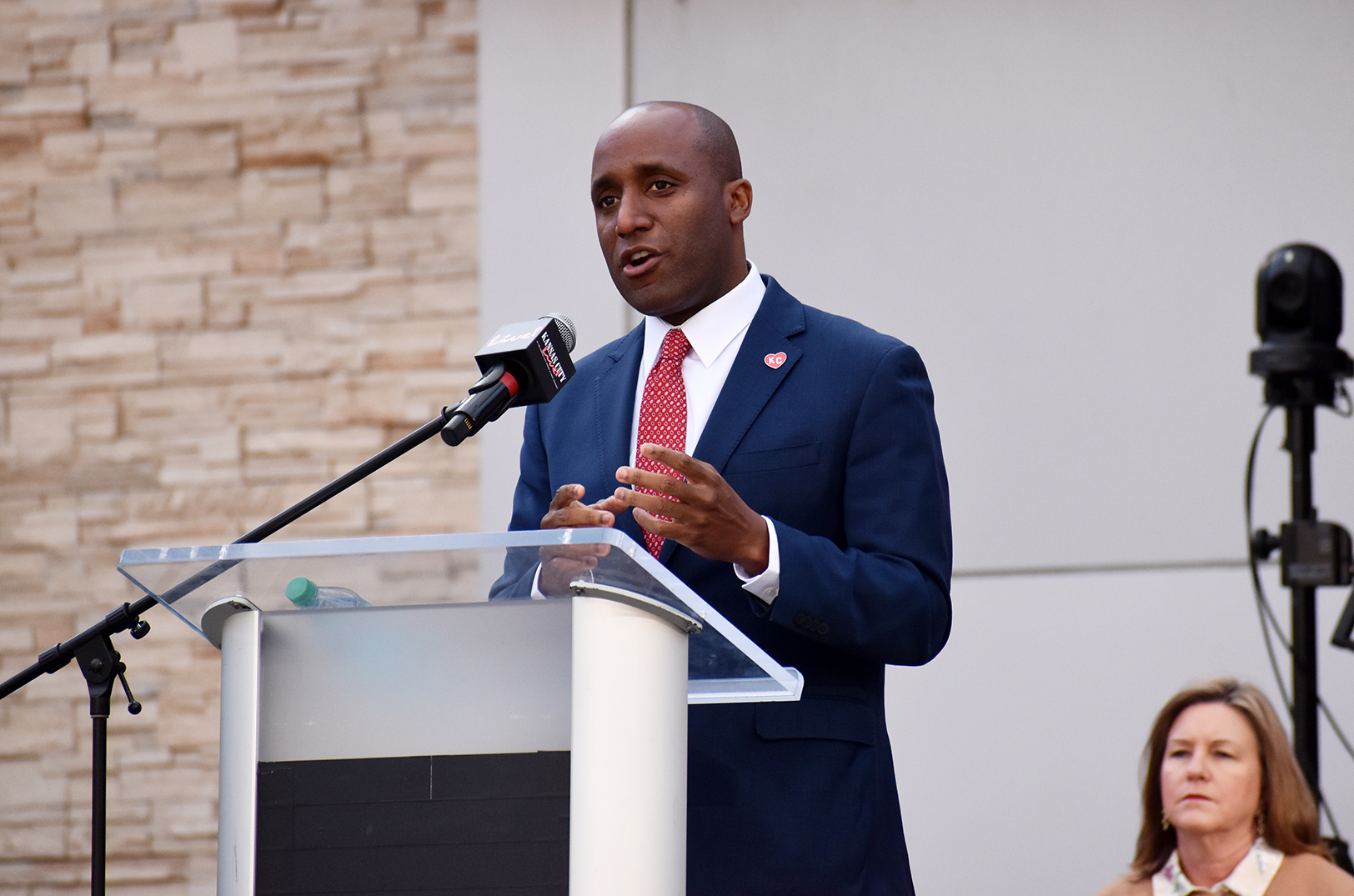 KCMO Mayor Quinton Lucas speaks during a press conference in the Kansas City Live! block at Power & Light; photo by Nikki Overfelt Chifalu, Startland News