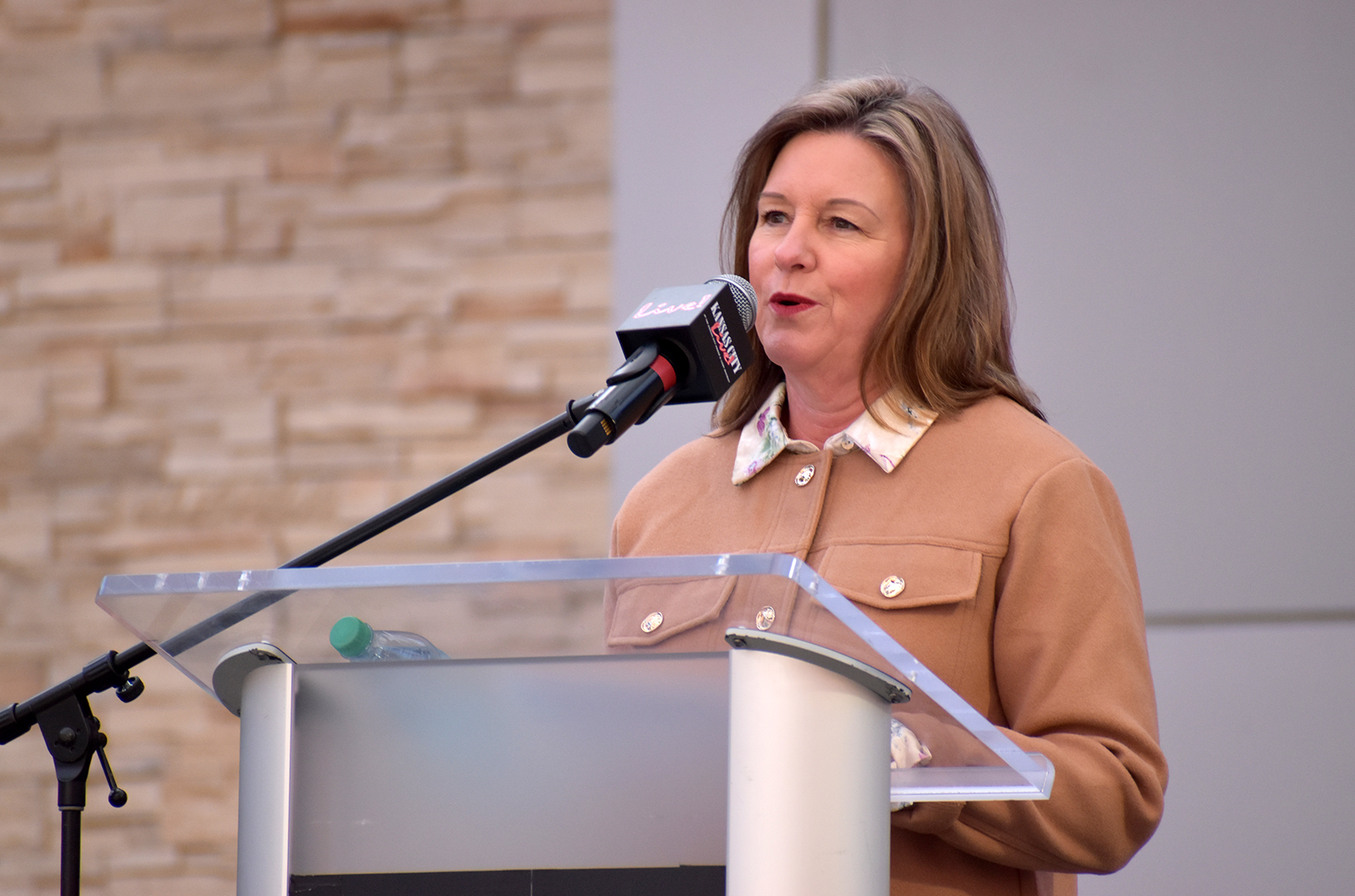 Kathy Nelson, Kansas City Sports Commission and Visit KC, speaks during a press conference in the Kansas City Live! block at Power & Light; photo by Taylor Wilmore, Startland News