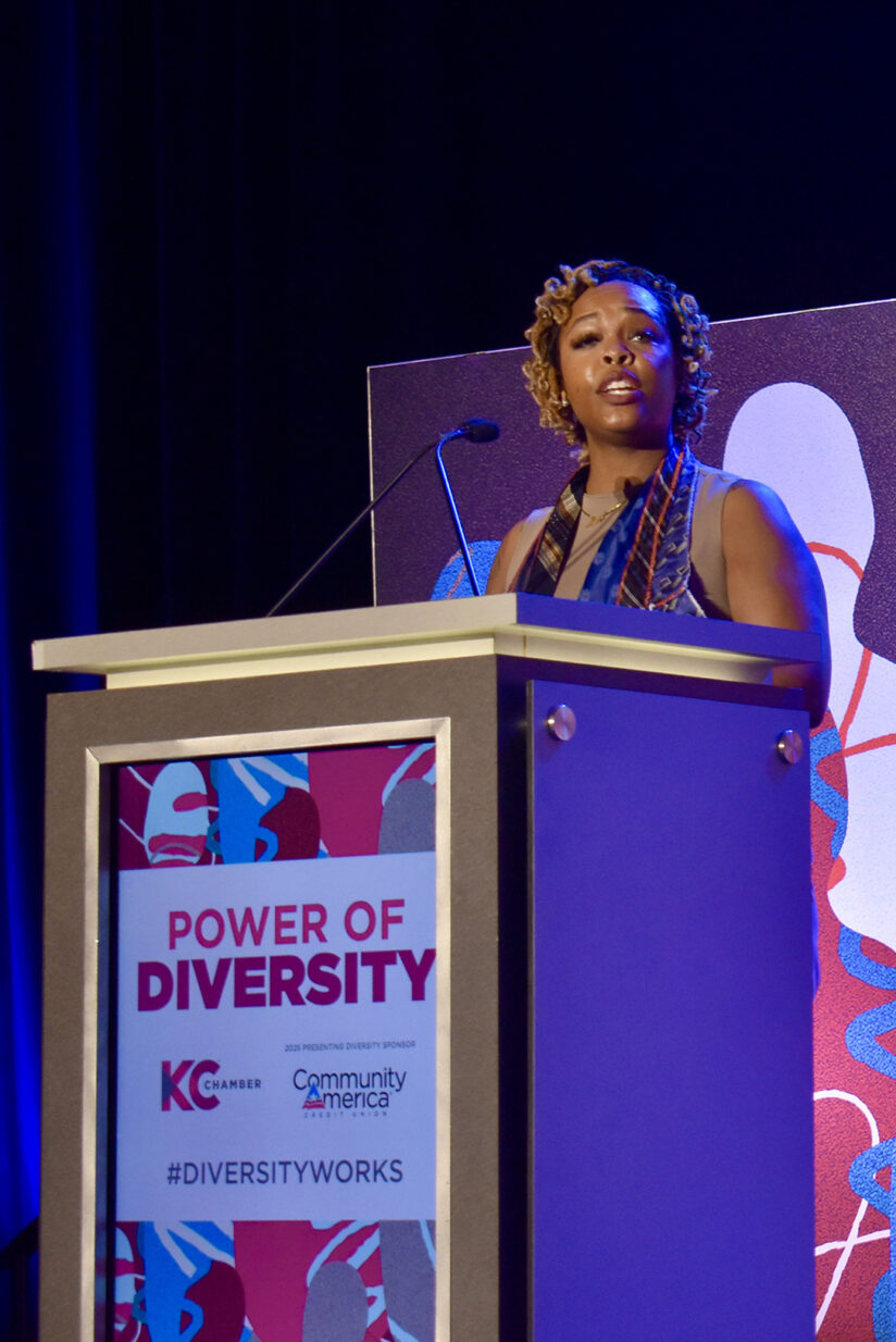 Amber Betts, director of human resources at reStart Inc., speaks after being awarded the Champion of Diversity Award at the KC Chamber’s POWER of Diversity Luncheon; photo by Taylor Wilmore, Startland News