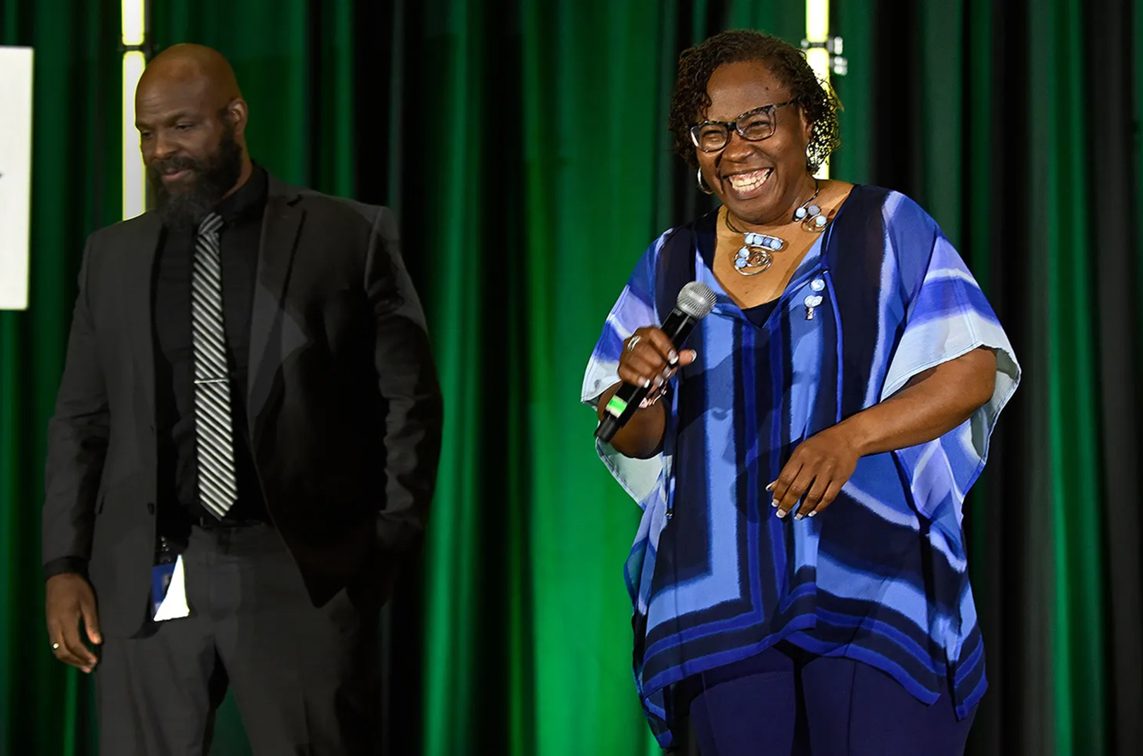 Dr. DeAngela Burns-Wallace, president of the Ewing Marion Kauffman Foundation, engages with students during the 2024 ProX Summer Showcase; photo courtesy of the Ewing Marion Kauffman Foundation