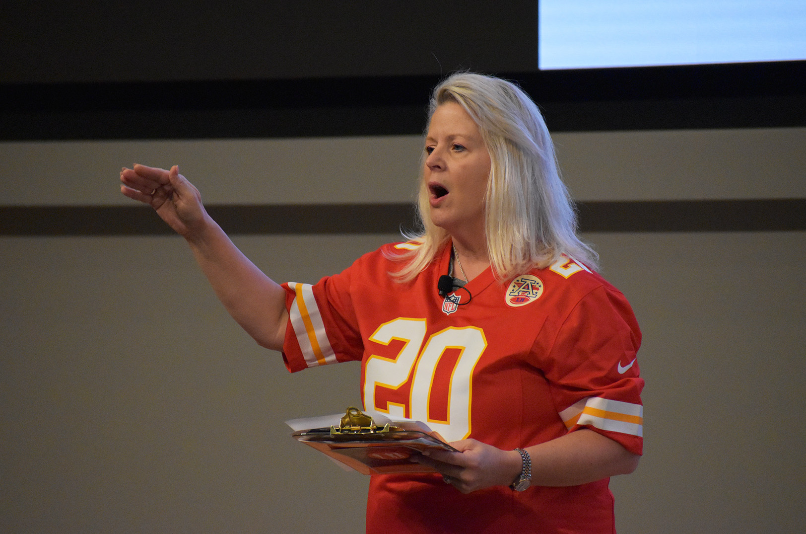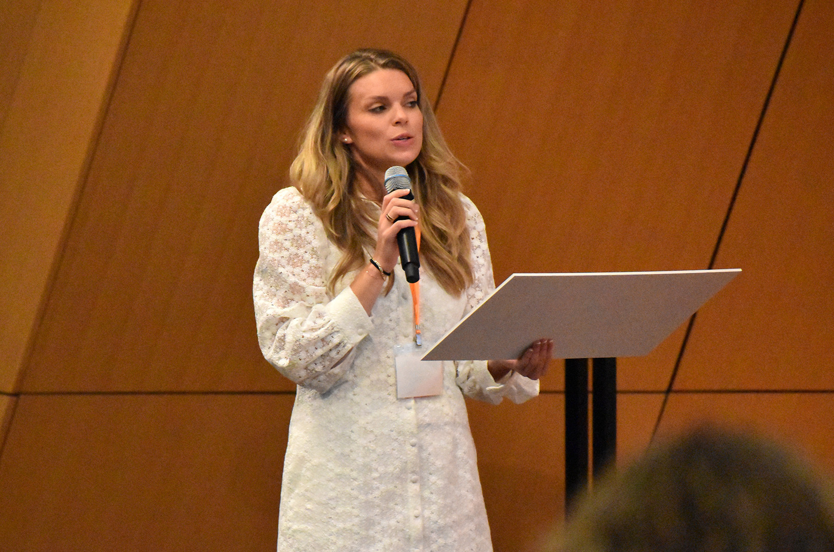 Melea McRae, Crux KC, leans forward to announce a funding award during the 2023 Pure Pitch Rally at the Burns & McDonnell Global Headquarters Auditorium; photo by Nikki Overfelt Chifalu, Startland News