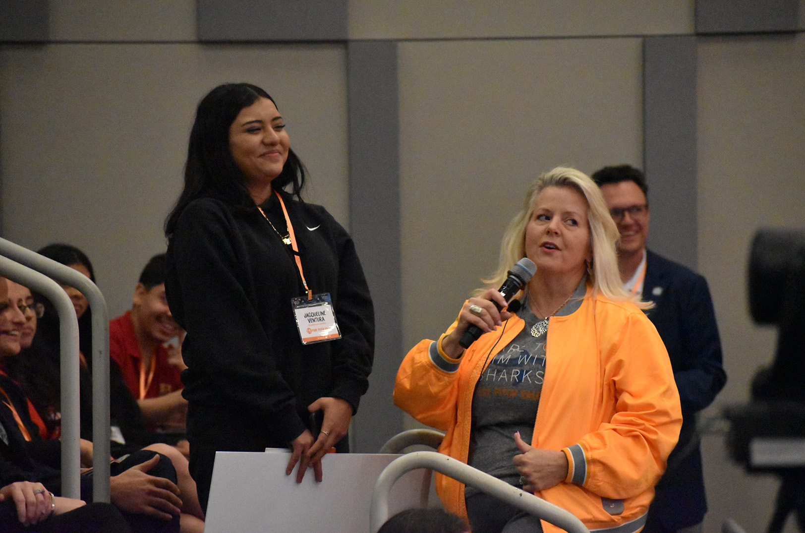 Karen Fenaroli, presenting sponsor and founder of the Pure Pitch Rally, right, announces a winning startup alongside a Kansas City high school student during the 2023 Pure Pitch Rally; Startland News photo