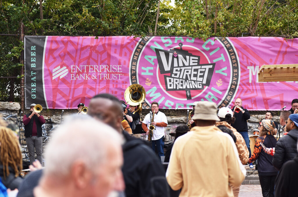 The Back Alley Brass Band performs behind Vine Street Brewing in the outdoor courtyard of 2000 Vine during the Prospect KC’s 2023 Gumbo Fest event; photo by Tommy Felts, Startland News