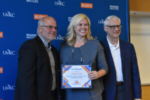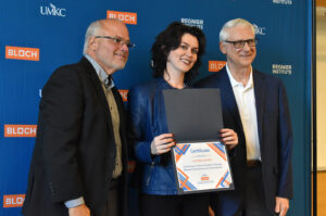 Dr. Shelley Cooper, Remodel Relief, center, accepts her first place award at UMKC’s RVCC; photo by Nikki Overfelt Chifalu, Startland News