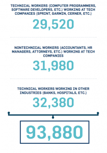 Kansas City’s tech industry is directly responsible for 93,880 jobs, according to the report. That total is comprised of tech workers at tech companies, non-tech workers working at tech companies and tech workers working at non-tech companies.