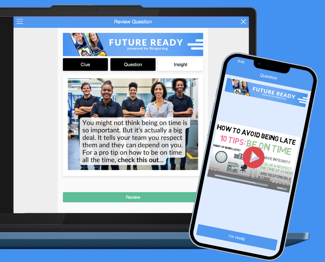 The Ringorang app notifies students when a live question is available to be answered about employability skills, which are life skills that are valued by employers, such as communication, cooperation, and adaptability. Students can join at any point during the school year and immediately compete for recognition as “Most Improved” and “Highest Performer.” Classrooms, schools and regions also compete for recognition, as well as for prizes like Amazon gift cards and merchandise donated by employers.