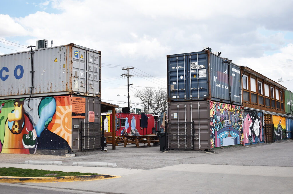 Iron District is an outdoor dining and retail destination that repurposed colorful shipping containers to provide a space for local businesses. The district also has an outdoor food court area and stage for musical performances.