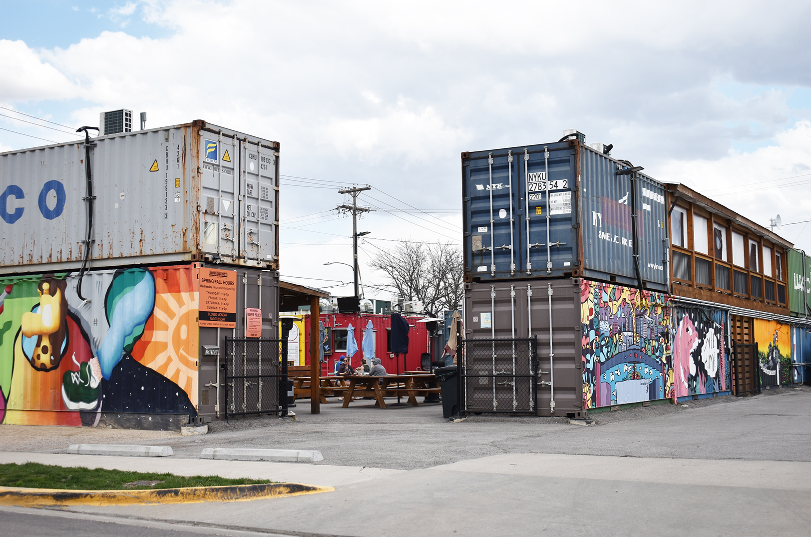 Iron District is an outdoor dining and retail destination that repurposed colorful shipping containers to provide a space for local businesses. The district also has an outdoor food court area and stage for musical performances.