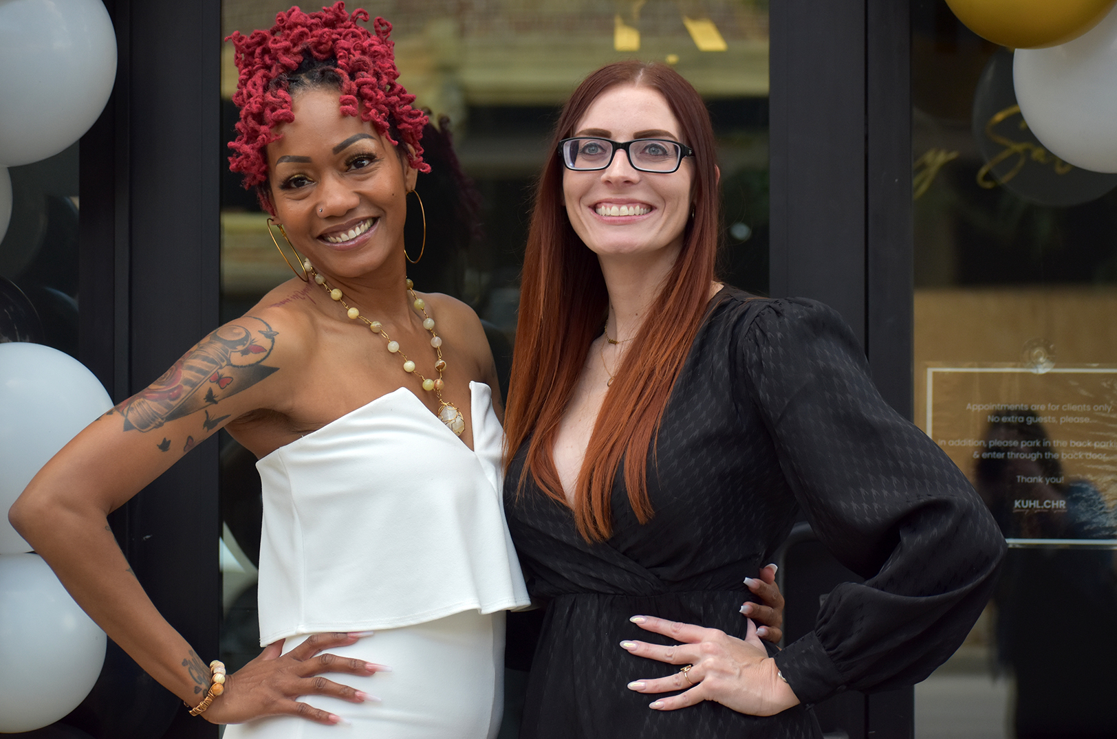 Kamill Bankhead and Brittany Strohm, Kuhl.chr Luxury Salon Suites, pose together outside the RS Impact Exchange retail hub on Troost Ave. during a launch event for the space; photo by Taylor Wilmore, Startland News