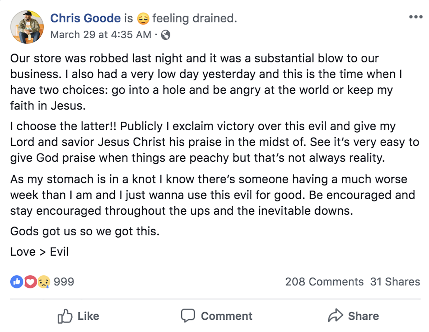 “I was against starting a GoFundMe following the recent robbery of our Troost location as I wanted nothing more than to give God glory in spite of the circumstances,” Goode wrote in a Facebook post. “However there was one created on our behalf anyway. I’m humbled just humbled. Being a kid from this community it’s amazing to have the support of an entire city when it matters most. I owe Kansas City so much and will continue to keep my heart for the city. #Godspeed”