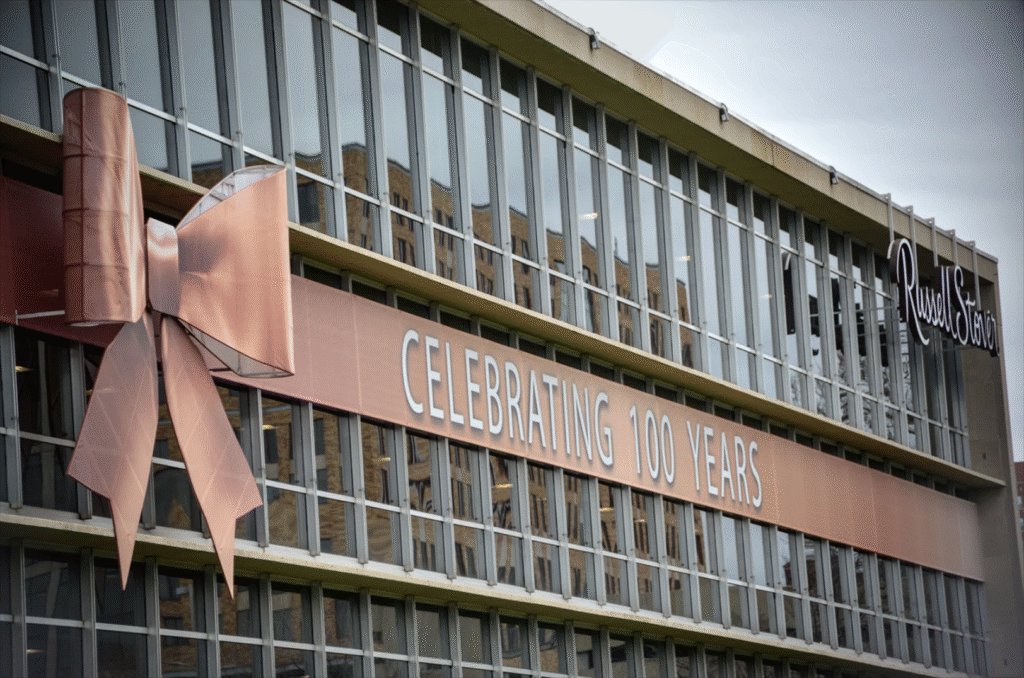 The Russell Stover building at Oak and Dr. Martin Luther King, Jr. Blvd. sits with a banner celebrating a century of business; photo by Carlos Moreno, KCUR 89.3