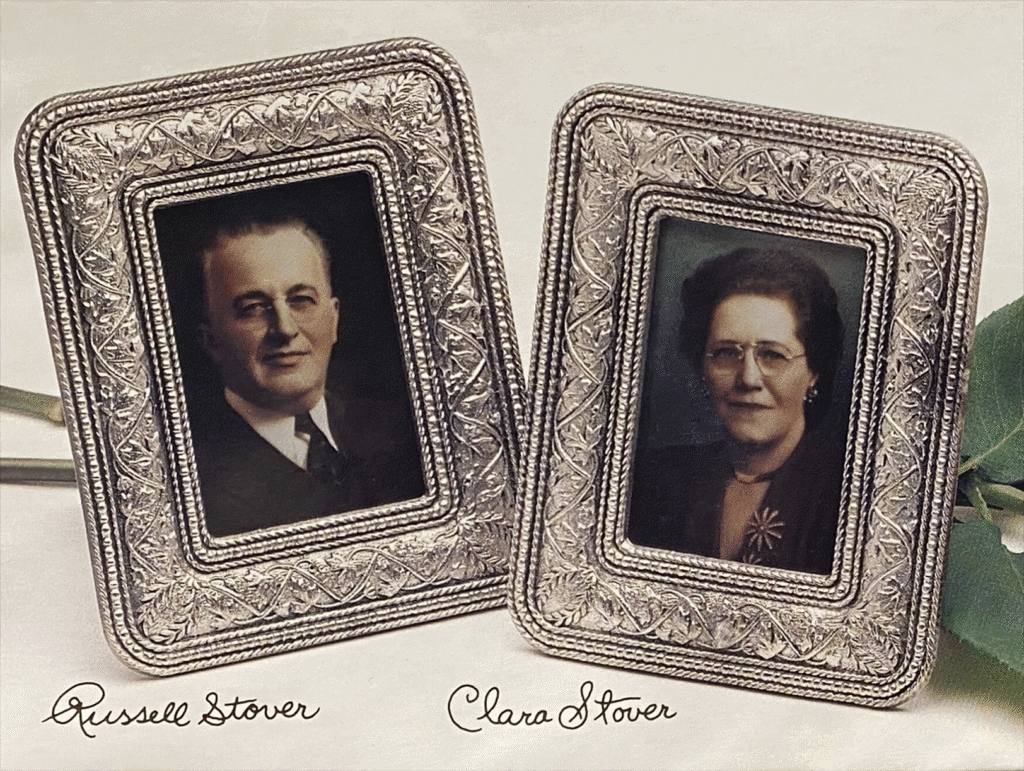 Images of Russell and Clara Stover that appeared on a special box of Russell Stover’s candy celebrating the company founders; photo by Laura Ziegler, KCUR