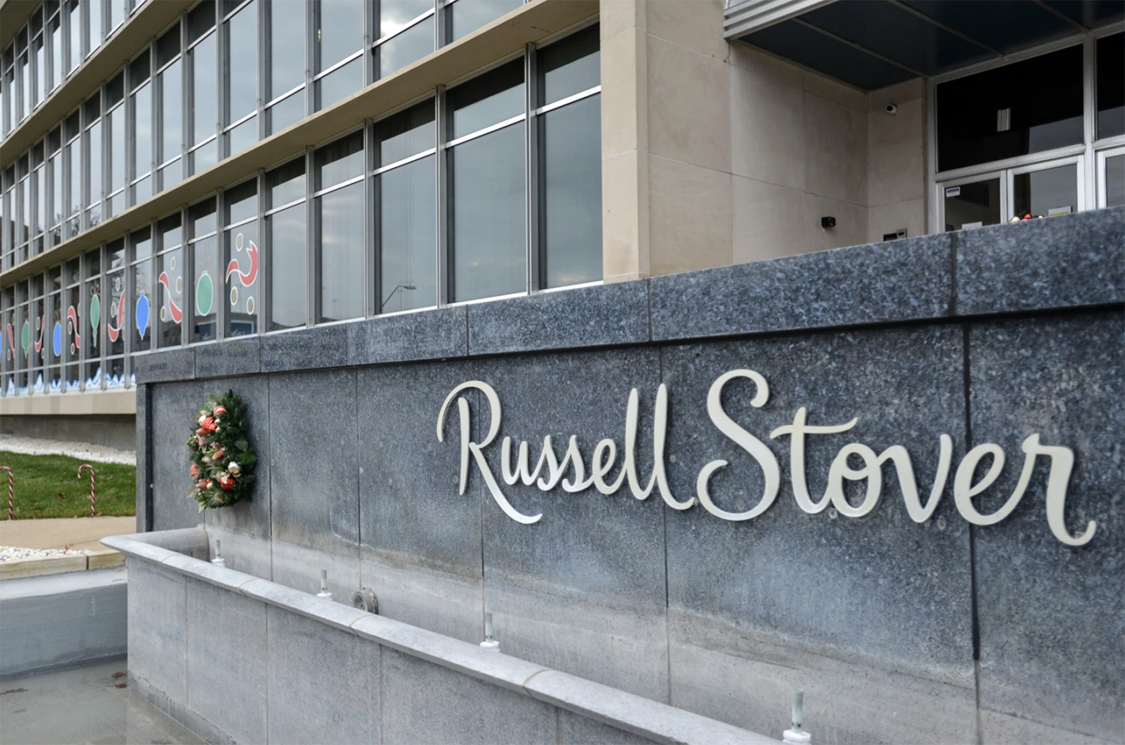 The Russell Stover building at Oak and Dr. Martin Luther King, Jr. Blvd. sits with holiday decorations adorning the front facade; photo by Carlos Moreno, KCUR 89.3