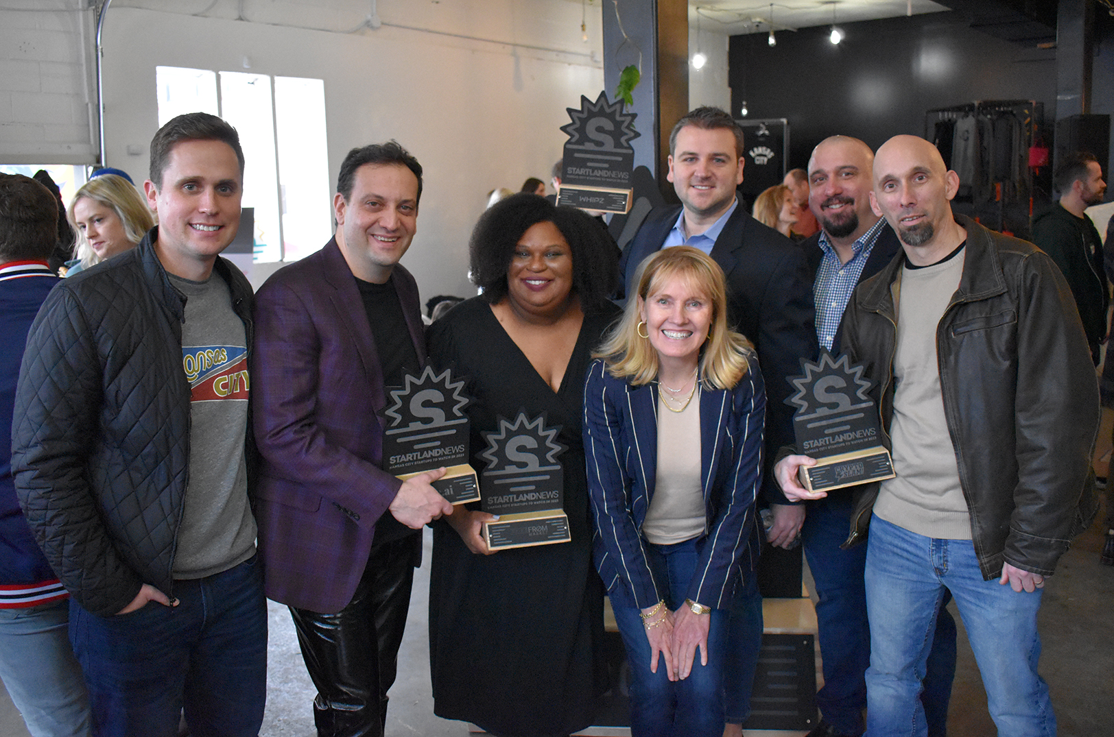 KCRise Fund portfolio companies honored as Startland News’ Kansas City Startups to Watch in 2023: Liam Reilly, KCRise Fund; Nick Smith, Saile, Emily Brown, Free From Market, Darcy Howe, KCRise Fund; Charles Clow, Whipz; Ryan Wasinger and Randy Wasinger, CryptoSlam; photo by Tommy Felts, Startland News RELATED: KCRise Fund closes $34M Fund III with ‘hyper-local’ focus; Here are its first four investments