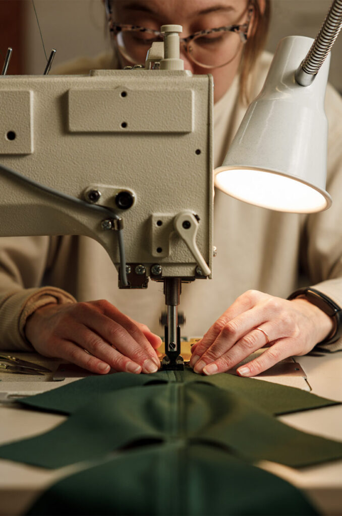 A Sandlot Goods worker sews one of the Kansas City company’s popular green dad hats, crafted for the “New Heights” podcast featuring Travis and Jason Kelce, in partnership with Homage; courtesy photo