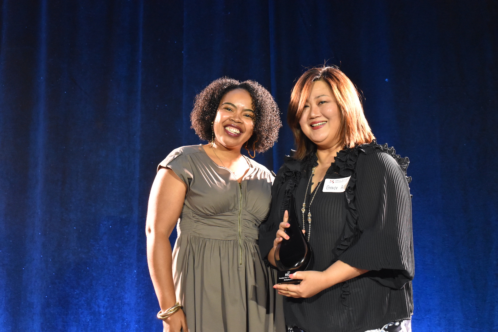 Grace Ahn, NVisionKC, right, is presented with the 2023 Emerging Small Business of the Year Award by La’Nesha Frazier, Bliss Books and Wine, during the KC Chamber’s Small Business Celebration; photo by Channa Steinmetz, Startland News