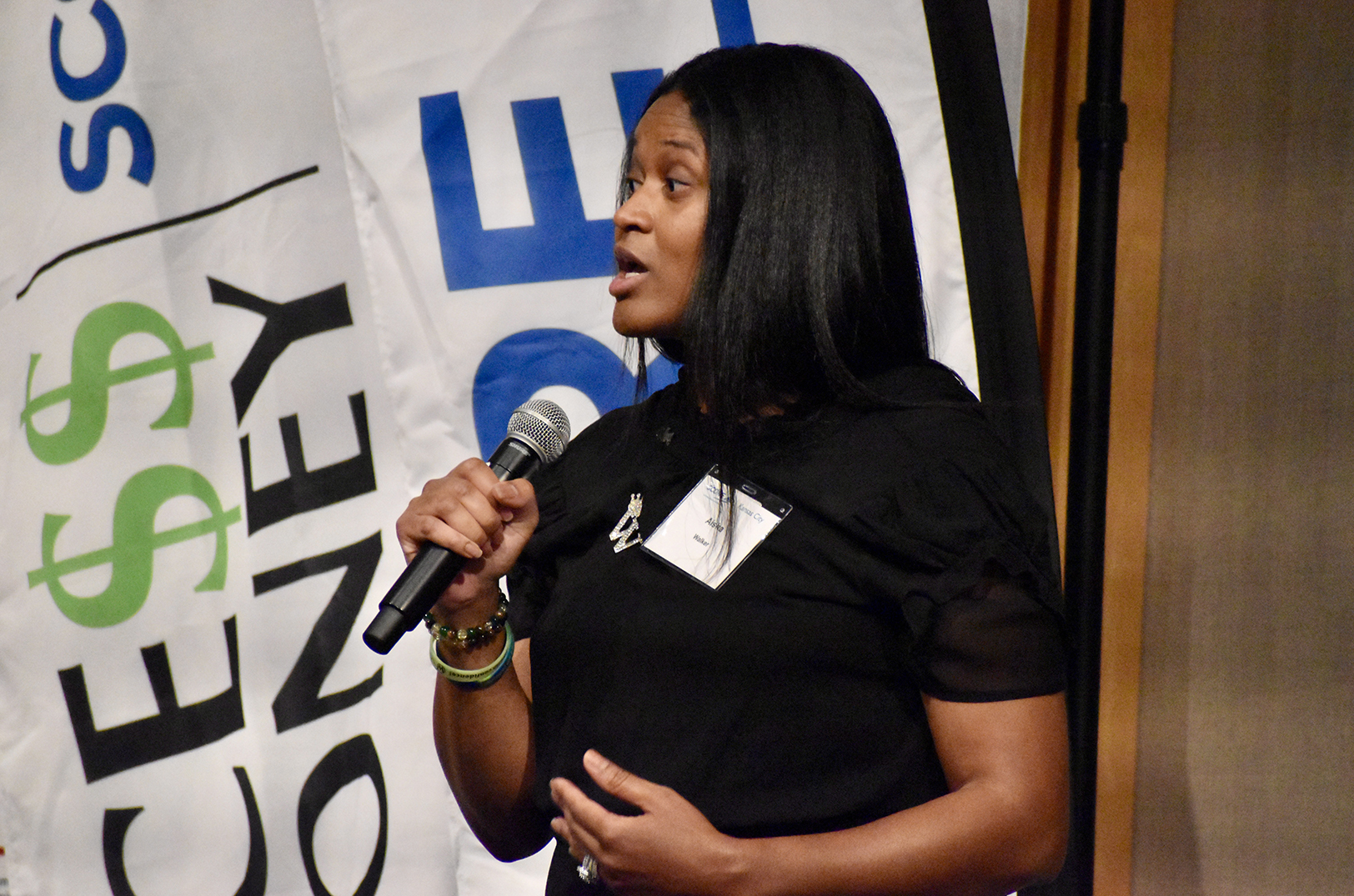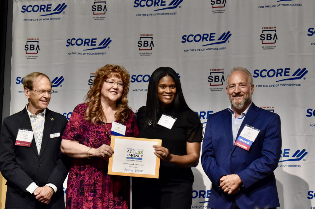 Aisha Walker, Walker Foundation, accepts her first place award during the SCORE Access to Money pitch competition; photo by Nikki Overfelt Chifalu, Startland News