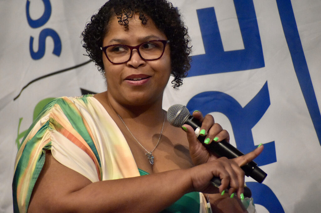 Aisha Walker, Walker Foundation, answers questions from judges during the SCORE Access to Money pitch competition; photo by Nikki Overfelt Chifalu, Startland News