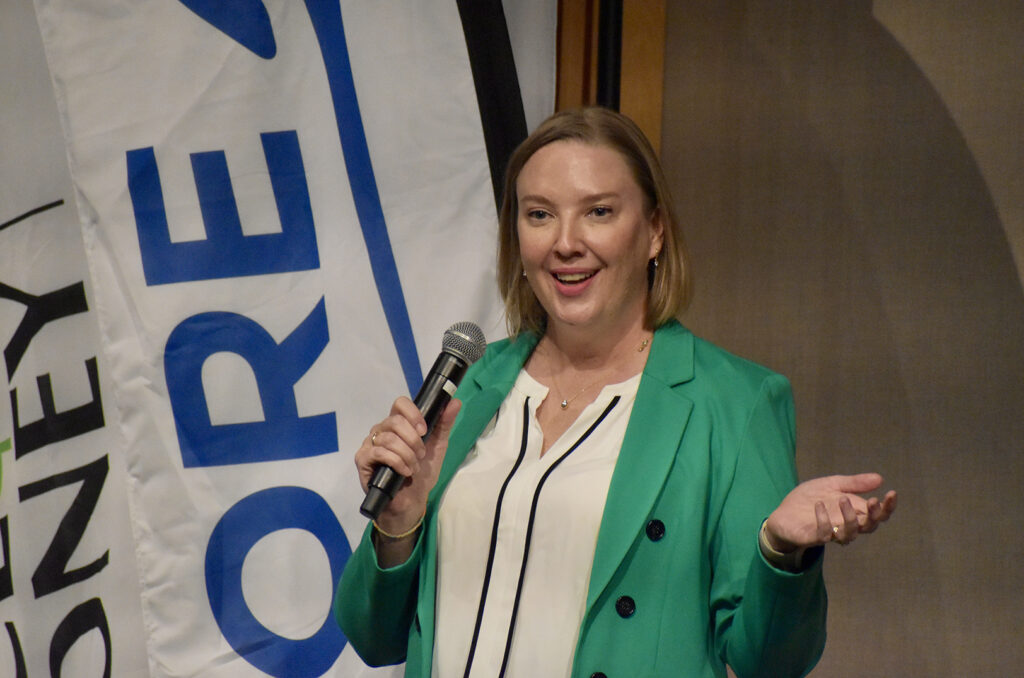 Antoinette Redmond, NeuroCompass, answers questions from judges during the SCORE Access to Money pitch competition; photo by Nikki Overfelt Chifalu, Startland News