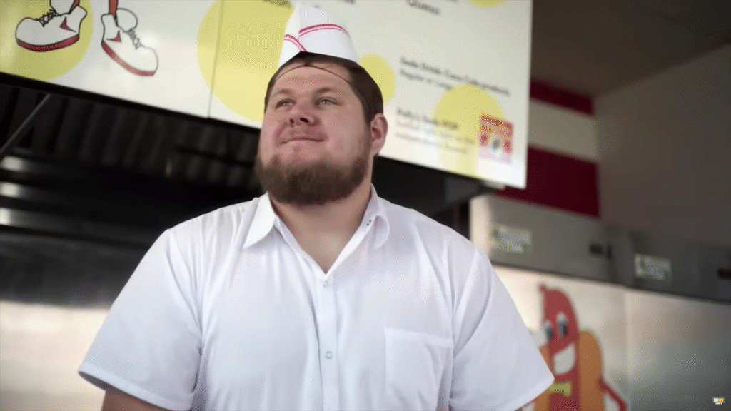 Chiefs offensive lineman Creed Humphrey stands in a mock diner in “Falling for Football” with restaurant details designed by local creatives at Collective Ex; photo still courtesy of the Kansas City Chiefs