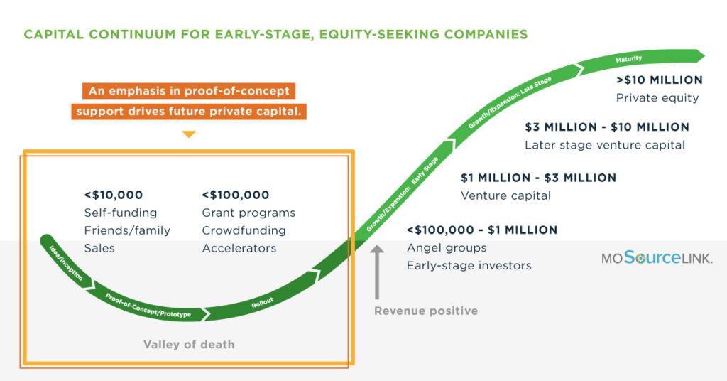 - The pipeline of growth companies needs support at the early stages. Grants play a critical role by fueling companies too new for investors who often expect immediate returns. Data from programs like Digital Sandbox KC prove that investing in companies’ earliest stages helps them survive the “valley of death” and leads to follow-on funding. Federal grants are one avenue for early-stage funding, but Missouri lags compared to leading states in taking advantage of federal research grants (SBIR/STTR).