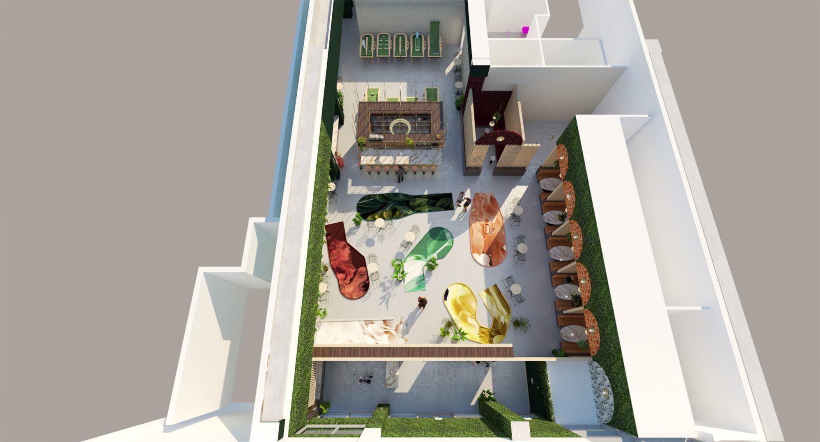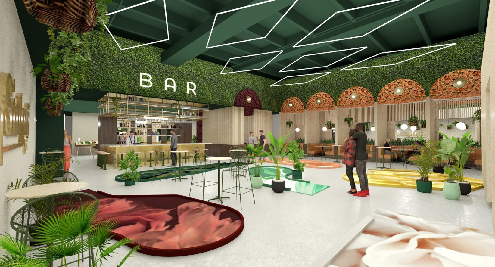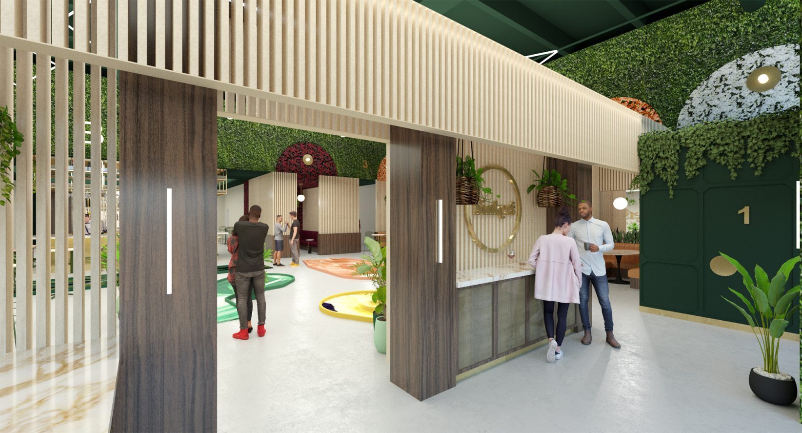 When individuals are not playing mini golf, they can hang out in the open seating and grab a drink from the cocktail bar or a bite from the kitchen.