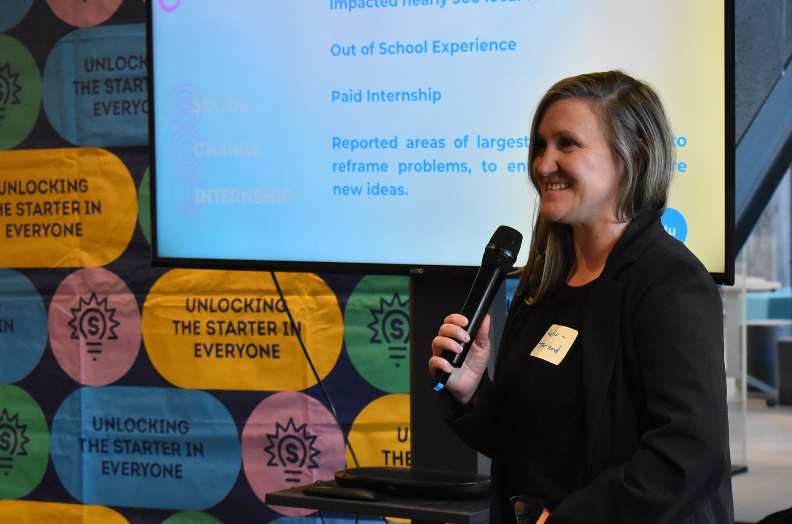 Katie Kimbrell, chief education officer for Startland Education, speaks to the crowd during the Social Change Internship (SCI) student showcase; photo by Taylor Wilmore, Startland News