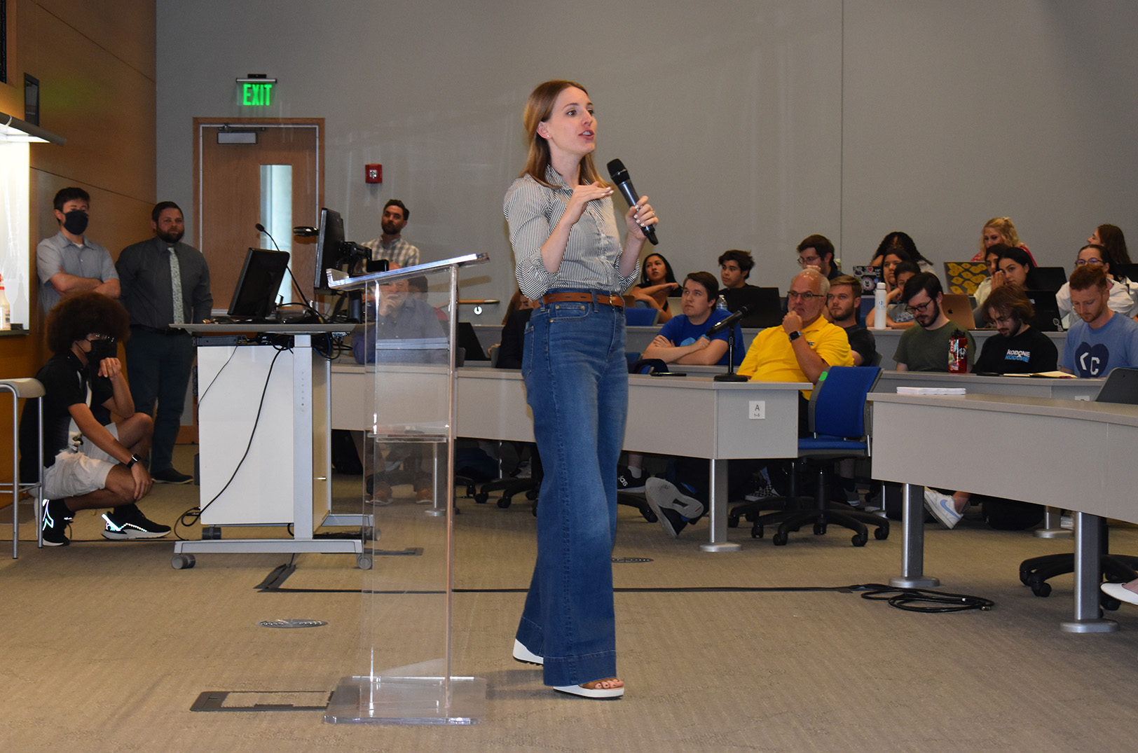 Alex Krause Matlack speaks during a First Tuesdays event in October 2023 at UMKC; Startland News photo