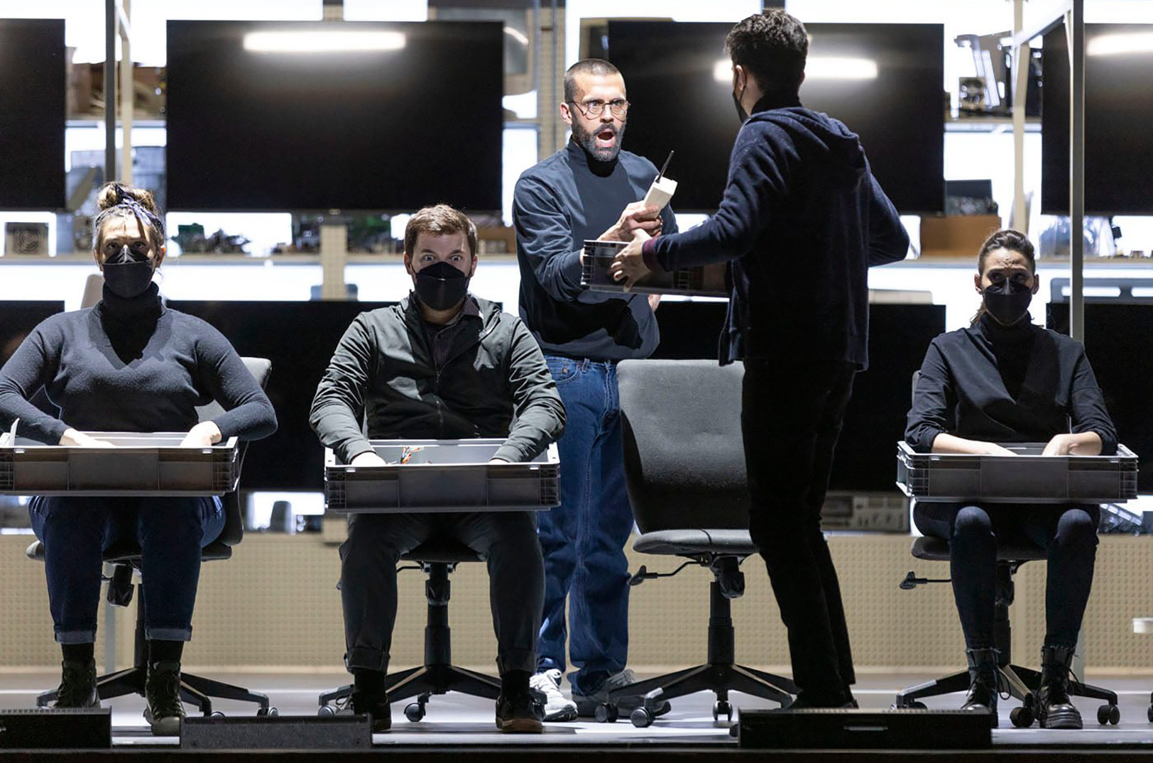 “You’ll see a gray set that is made with all peg boards,” said Kanouse, describing the final product. “We usually don’t make sets out of pegboard. There are 28 TV’s mounted throughout with three different levels of the stage, the stage level, a platform landing, and the bridge.”