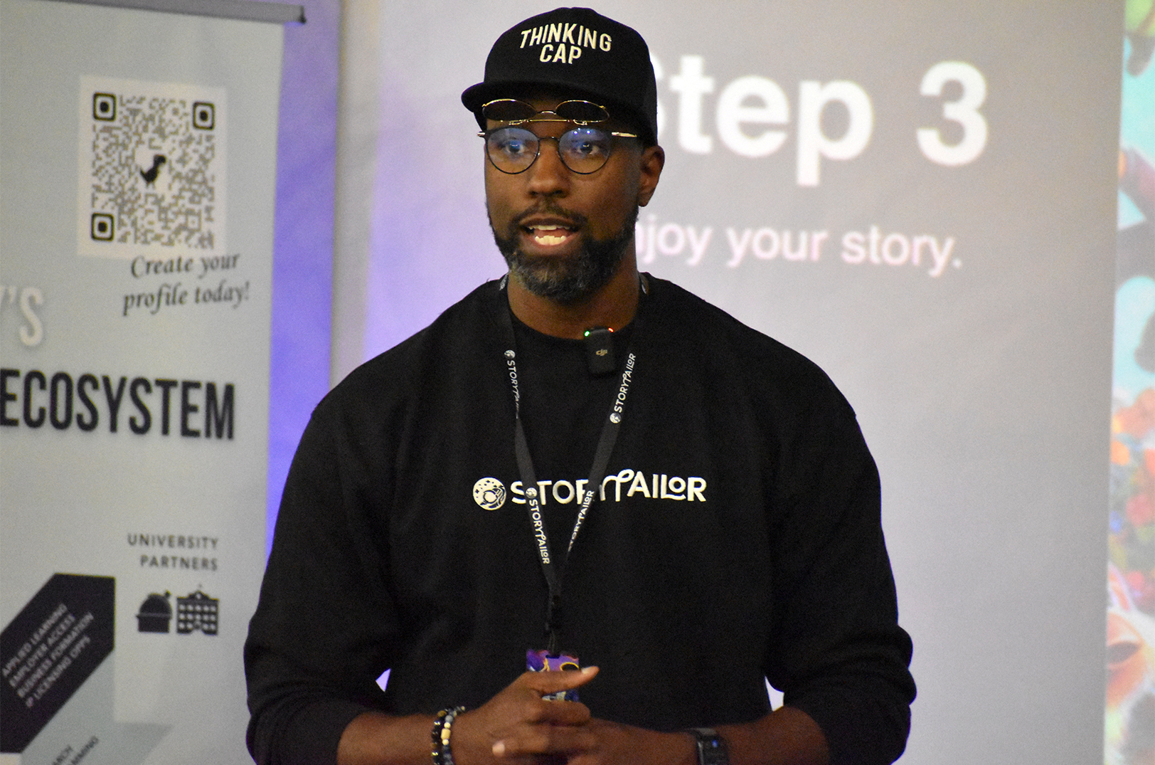 Herston Fails, chief product officer for Storytailor, details changes to the platform during a demo day event for LaunchKC’s Social Venture Studio; photo by Taylor Wilmore, Startland News