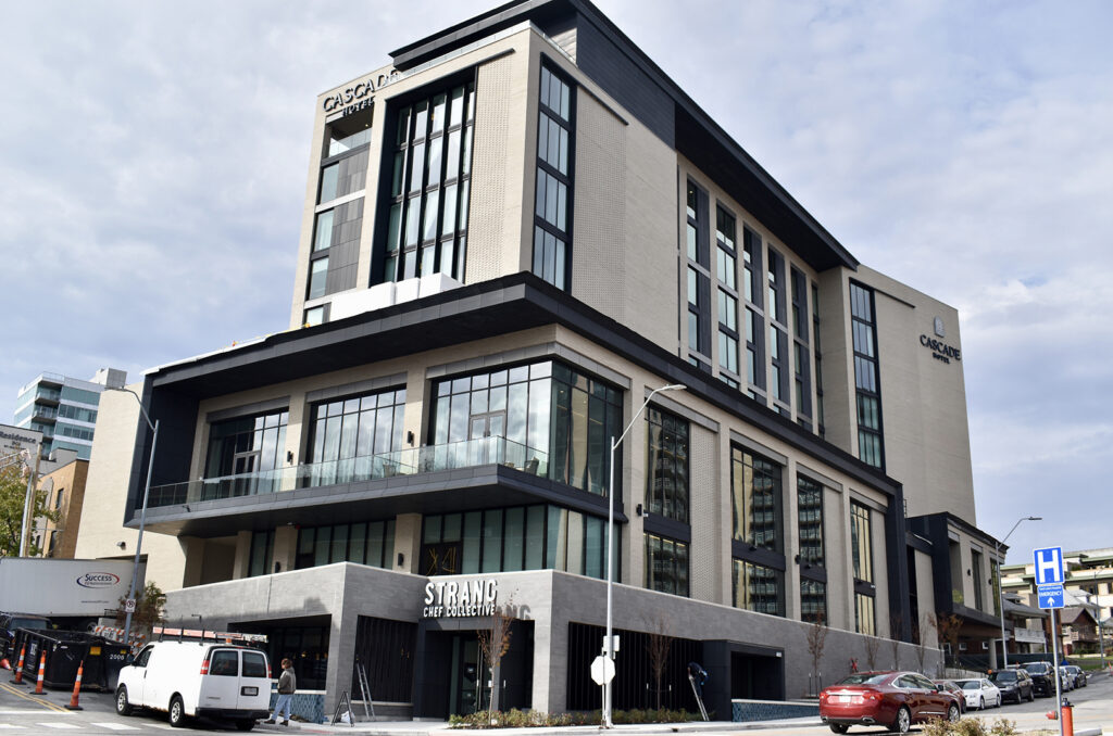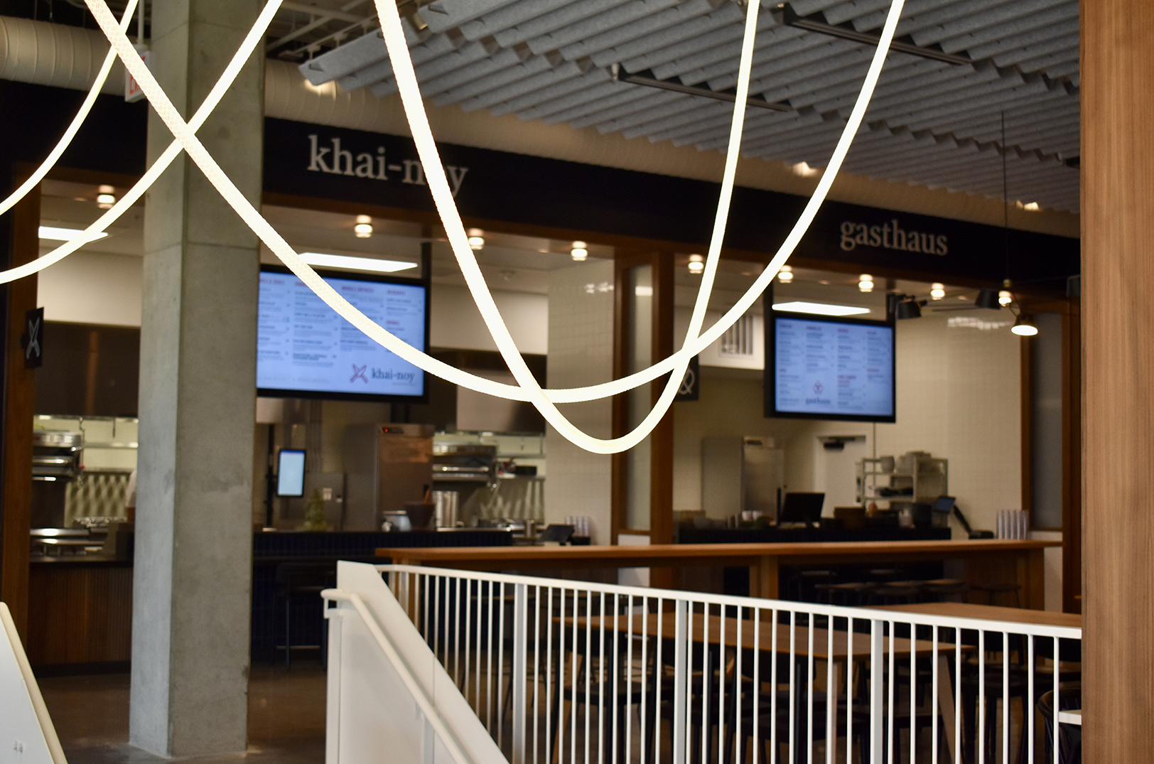 The new chef collective space on the Plaza — which was announced in February and will be open for breakfast, lunch, dinner, and late-night eats — spans 11,000 square feet over two floors and includes two full-service bars and outdoor dining space, plus provides dining, room service, catering, and a coffee bar to guests at the Cascade Hotel (which is set to open on Tuesday) and, eventually, the Marriott Aloft Hotel.