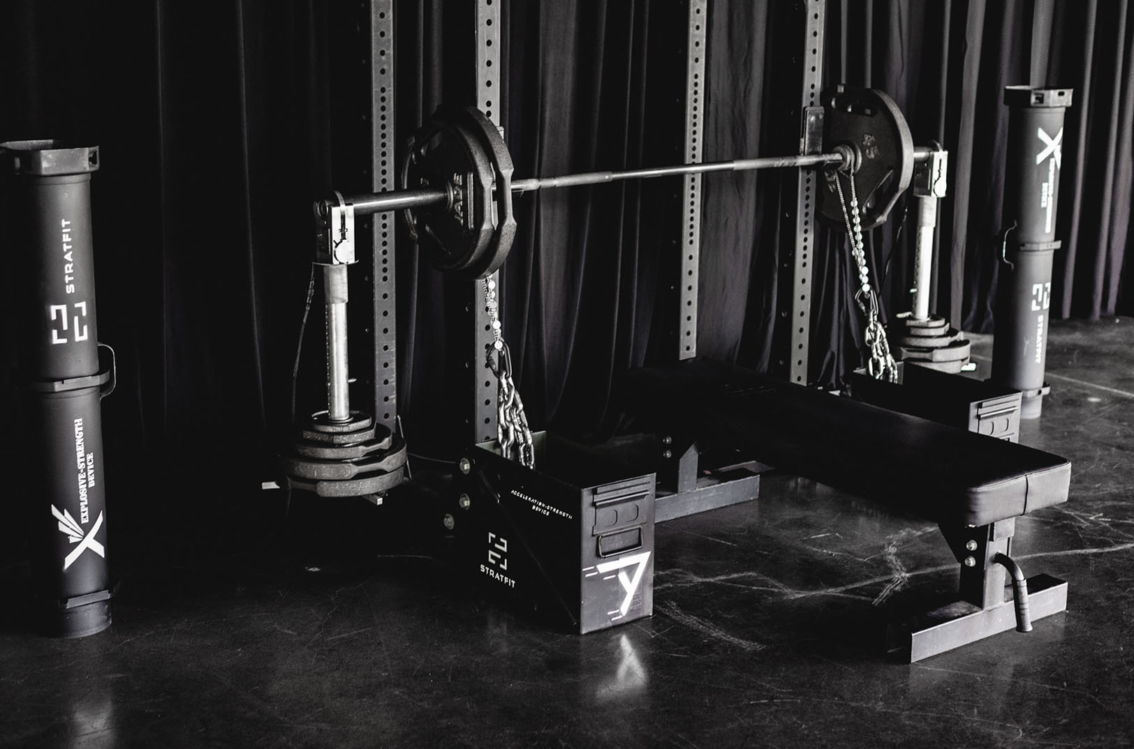 StratFit’s Power Training Arsenal includes the Explosive Strength Training Device. A device is loaded onto each end of a barbell. The trainer adjusts the height of the device according to the exercise and the lifter’s height. Weight plates are loaded onto the devices based on the lifter’s strength. The device automatically adjusts and lessens the weight load during the bottom position of a squat, enabling the lifter to maximize the explosion of upward power.