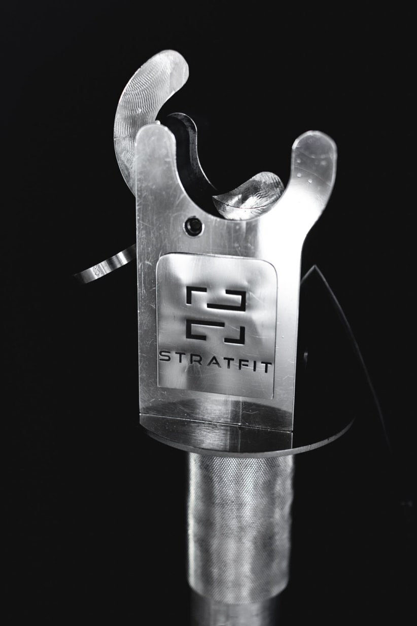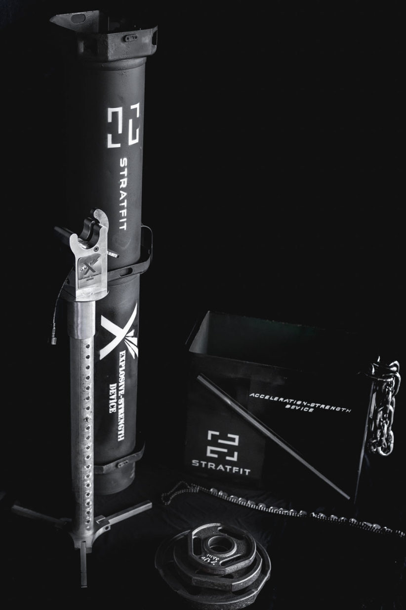 StratFit’s Power Training Arsenal includes the Explosive Strength Training Device. A device is loaded onto each end of a barbell. The trainer adjusts the height of the device according to the exercise and the lifter’s height. Weight plates are loaded onto the devices based on the lifter’s strength. The device automatically adjusts and lessens the weight load during the bottom position of a squat, enabling the lifter to maximize the explosion of upward power.