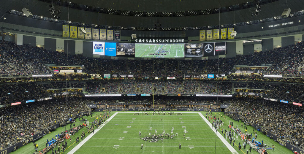 Field view from inside the Ceasars Superdome in New Orleans. Henderson Engineers’ work wrapped in August 2024, just as the New Orleans Saints football season began; photo courtesy of Henderson Engineers