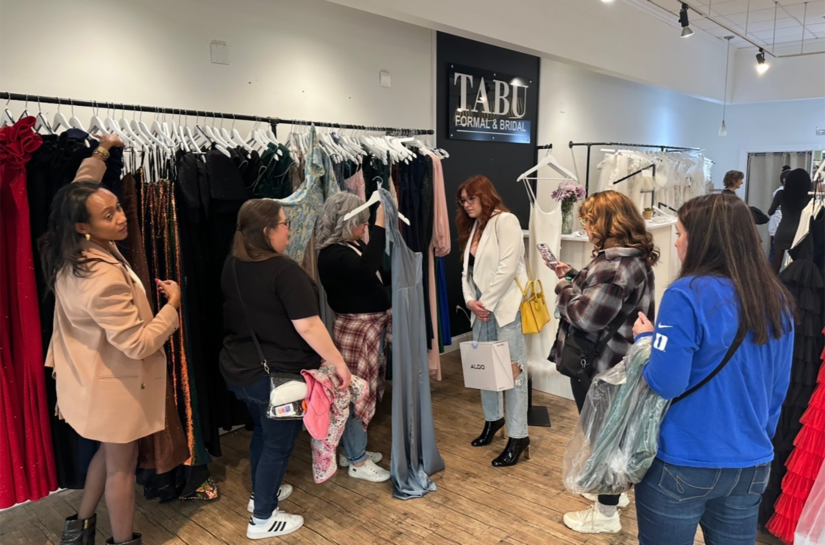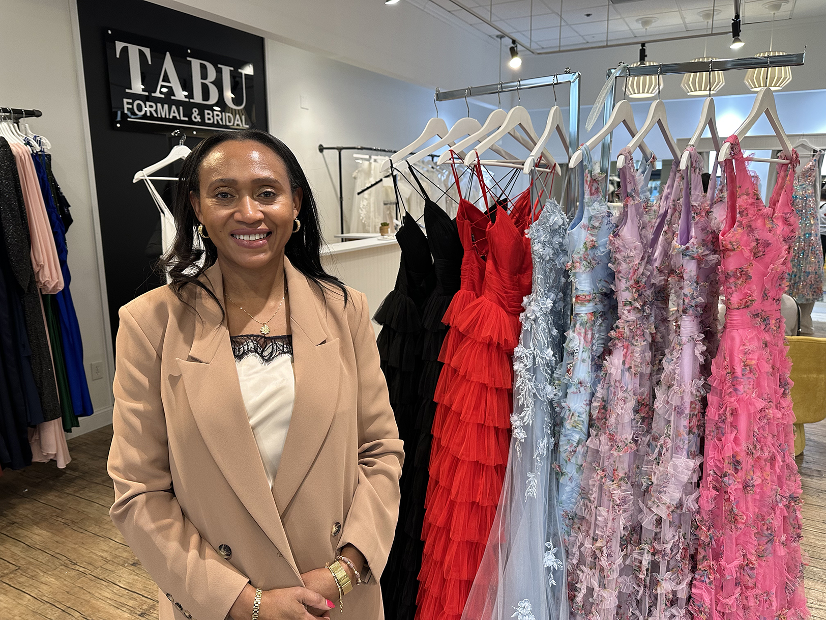 Several customers then headed over to Nzioki Hult’s new Tabu Formal & Bridal next door, where one bride-to-be was at a three-sided mirror — checking her white satin, off-the-shoulder mermaid gown at all angles. Other consumers checked out party dresses.