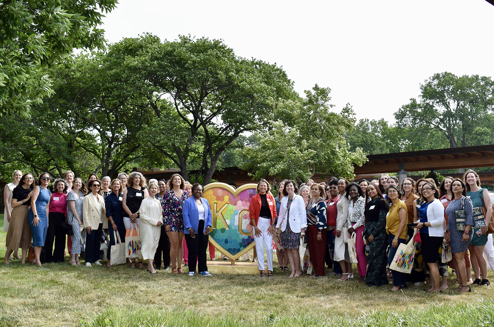 “Takes Heart: A Celebration of Women Entrepreneurs” event attendees gather around the “Takes Heart” Parade of Hearts entry on the Kauffman Foundation campus; photo courtesy of United WE