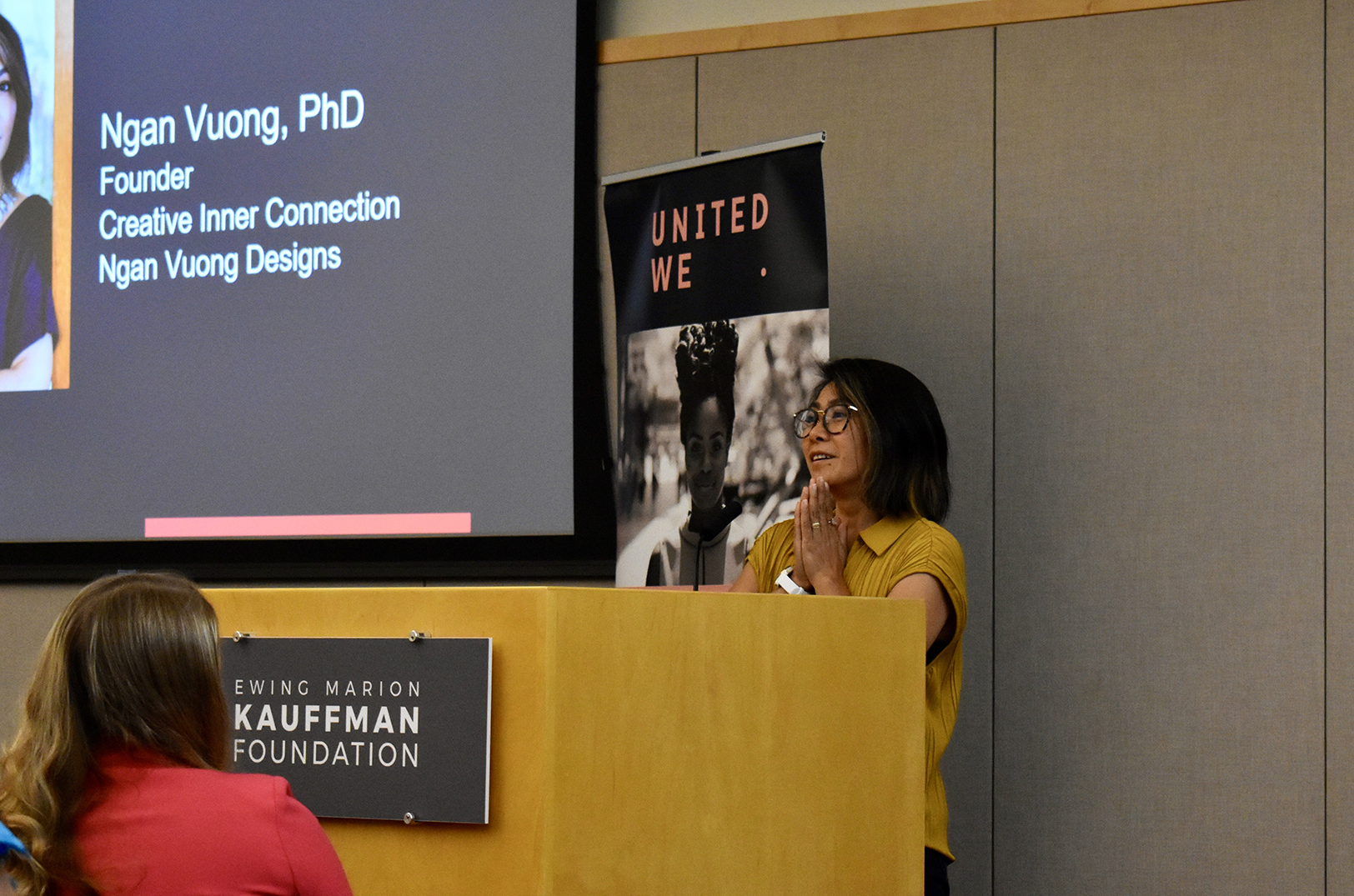 Dr. Ngan Vuong shares her journey during the “Takes Heart: A Celebration of Women Entrepreneurs” event at the Ewing Marion Kauffman Foundation; photo courtesy of United WE