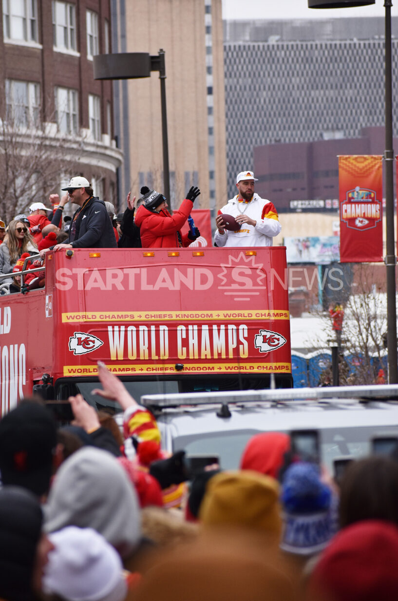 Travis Kelce prepares to toss a football to fans after signing it next to his mother during the Chiefs Super Bowl victory parade in February 2023; photo by Tommy Felts, Startland News