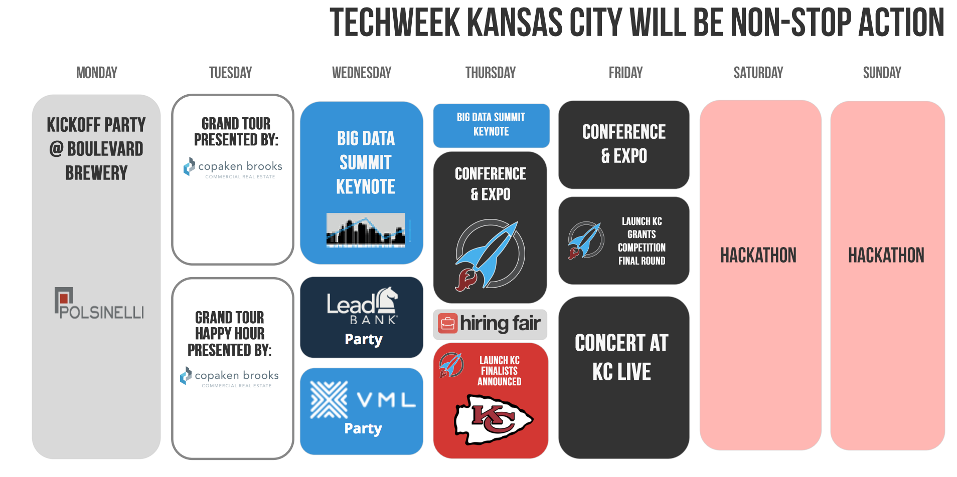 The conference will begin with a kickoff party Sept. 14 at the Boulevard Brewery, and will feature other events including a pitch competition, job fair, concert and hackathon. Here’s a rough version of the schedule, provided by Techweek.
