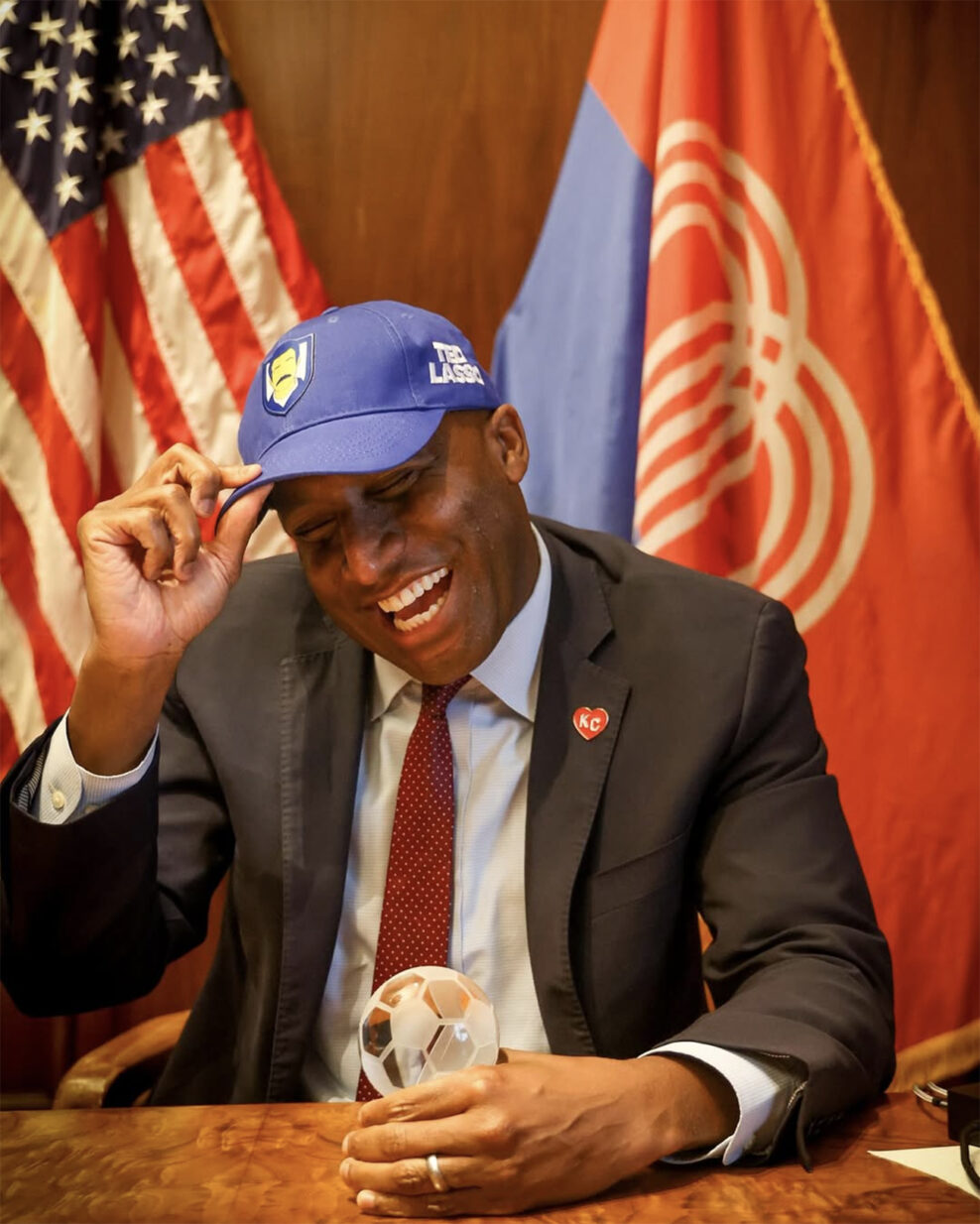 Quinton Lucas, mayor of Kansas City, Missouri, wears a “Ted Lasso” cap in a photo from his announcement of the show’s filming in Kansas City; photo courtesy of the Mayor’s Office