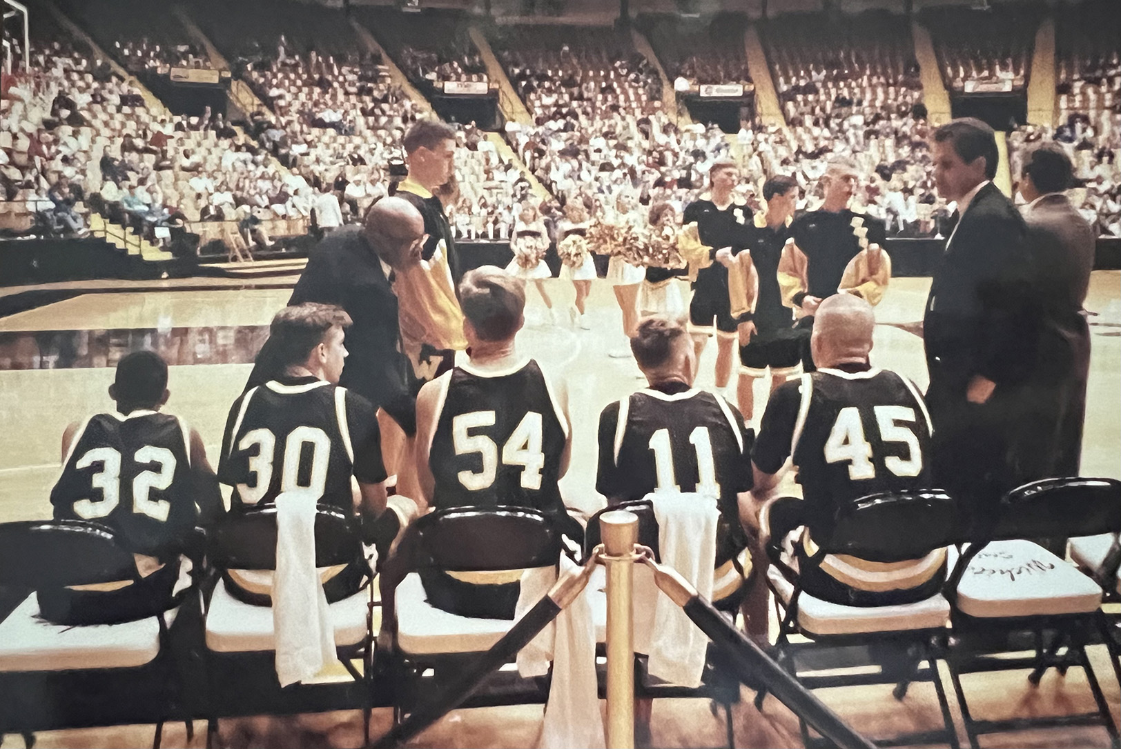 Jason Sudeikis (30) and Brendan Curran (11) prepare to play during a 1994 Shawnee Mission West basketball game