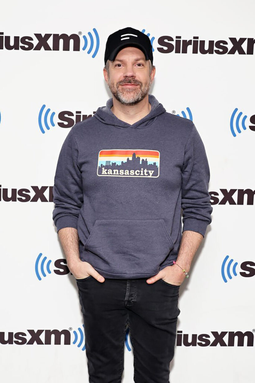 “Ted Lasso” actor Jason Sudeikis, center, wears a Three KC hooded sweatshirt in a promotional appearance with the Apple TV show’s cast