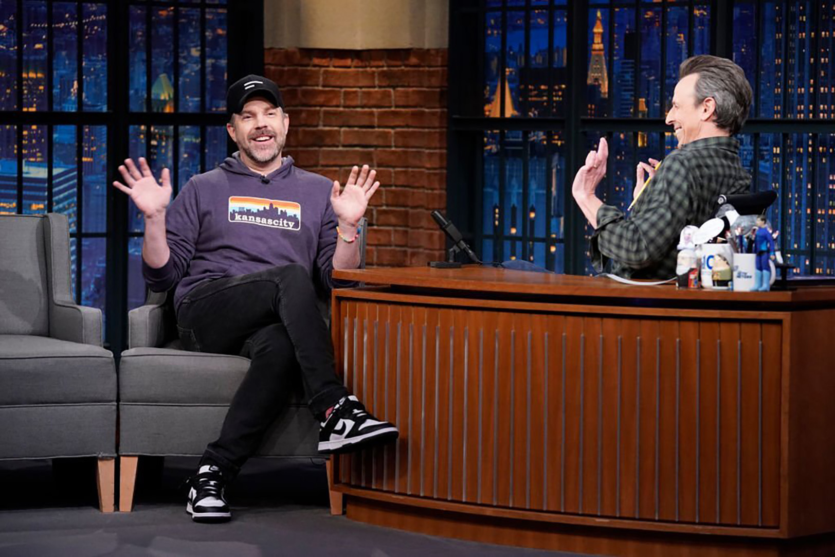 “Ted Lasso” actor Jason Sudeikis wears a Three KC hooded sweatshirt during an interview on “Late Night with Seth Meyers”