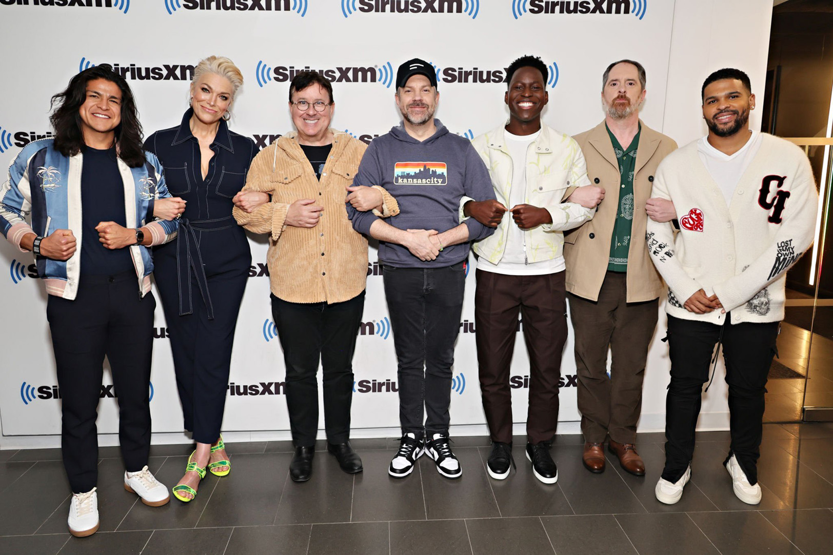 “Ted Lasso” actor Jason Sudeikis, center, wears a Three KC hooded sweatshirt in a promotional appearance with the Apple TV show’s cast