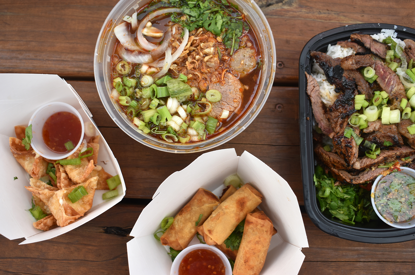 Thaiger’s simple menu of intricate flavors consists of: ribeye steak bowl, crispy pork belly bowl, lao spicy pho, egg rolls and crab rangoon.